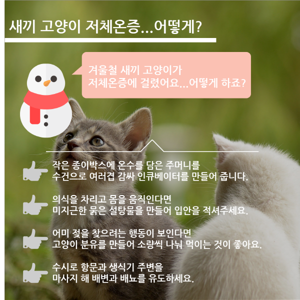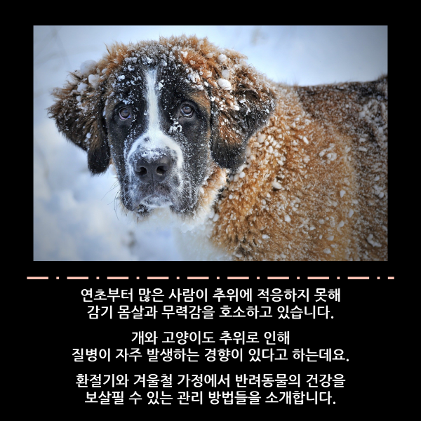 [이지경제] 이민섭 기자 = 연초부터 많은 사람이 추위에 적응하지 못해 감기 몸살과 무력감을 호소하고 있습니다. 개와 고양이도 추위로 인해 질병이 자주 발생하는 경향이 있다고 하는데요. 환절기와 겨울철 가정에서 반려동물의 건강을 보살필 수 있는 관리 방법들을 소개합니다.