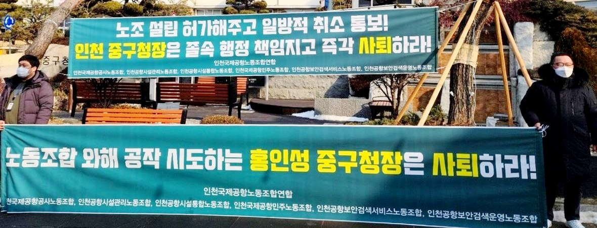 여기에 더불어민주당 출신인 홍인성 인천 중구청장 역시 보안검색서비스노조의 조합 설립신고필증을 교부한 지 10개월이 지나 직권 취소 예정통지를 했다.