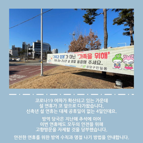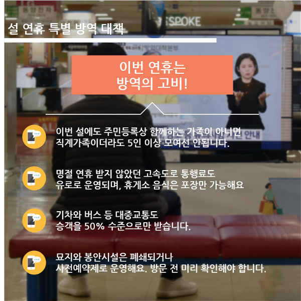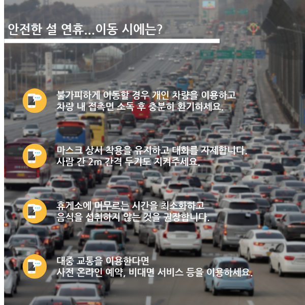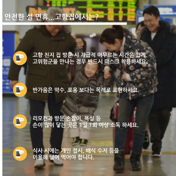 [이지경제 = 이민섭 기자] 코로나19 여파가 확산되고 있는 가운데 설 연휴가 코 앞으로 다가왔습니다. 신축년 설 연휴는 대체 공휴일이 없는 4일인데요. 방역당국은 지난해 추석에 이어 이번 연휴에도 모두의 안전을 위해 고향방문을 자제할 것을 당부했습니다. 안전한 연휴를 위한 방역 수칙과 명절 나기 방법을 안내합니다.