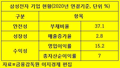 지난해 삼성전자의 총부채(102조2877억원)와 총자본(275조9480억원)이 모두 전년보다 각각 14%(12조6036억원), 8%(21조0325억원) 늘었지만, 코로나19 대응 등에 따른 비용이 더 상승했기 때문이라는 게 증권가 풀이다.