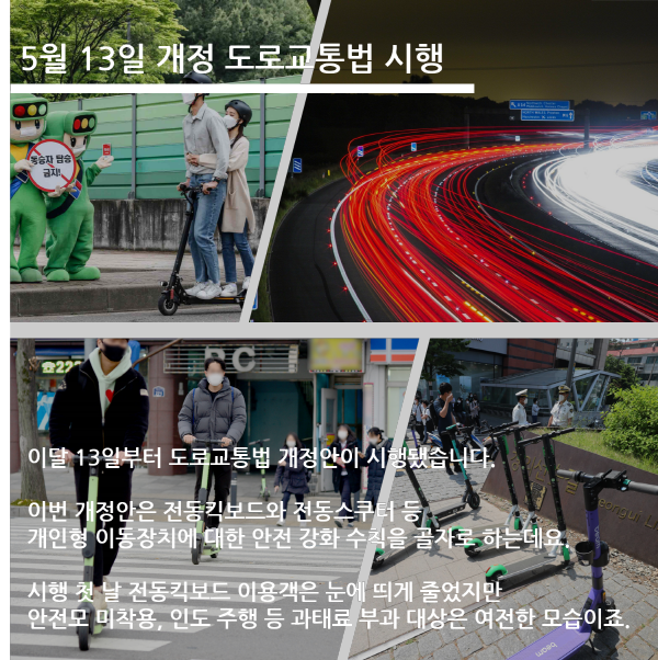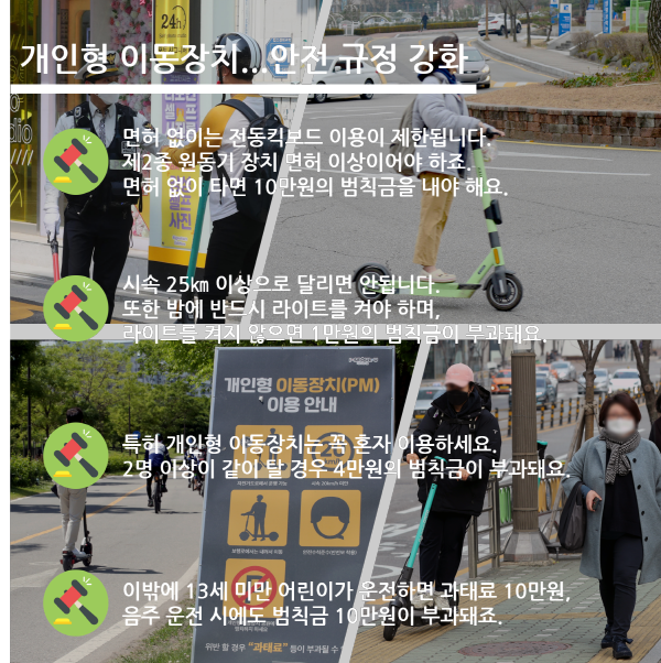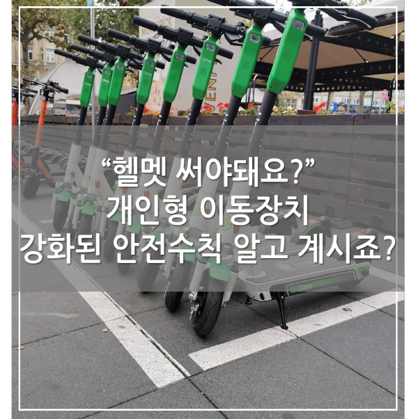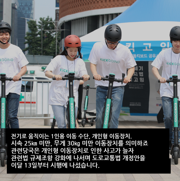 [이지경제 = 이민섭 기자] 전기로 움직이는 1인용 이동 수단, 개인형 이동장치. 시속 25㎞ 미만, 무게 30㎏ 미만 이동장치를 의미하죠. 관련당국은 개인형 이동장치로 인한 사고가 늘자 관련법 규제조항 강화에 나서며 도로교통법 개정안을 이달 13일부터 시행에 나섰습니다.