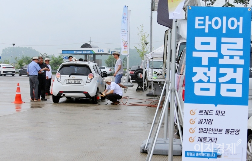 이들 협회와 기업이 지원한 기술진 각각 2명씩, 6명은 고속국도휴게소에서 전문 장비를 통해 타이어의 안전 상태를 점검한다.