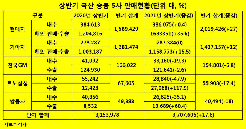 국산차 승용 5사가 1일 각각 발표한 ‘6월 자동차 판매 현황’을 2일 이지경제가 취합한 결과에 따르면 올해 상반기 이들 5사는 세계에서 370만7606대를 판매해 전년 동기(315만3978대)보다 판매가 17.6% 증가했다.