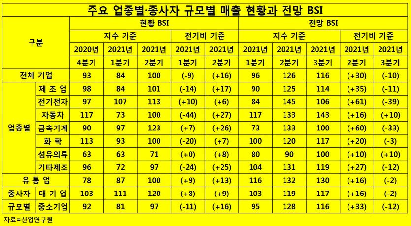 3분기 유형별 매출 전망은 BSI는 제조업(114)과 유통업(130)이 100을 넘었고, 자동차(143)와 섬유의류(100)를 제외한 대부분 업종 하락했다.