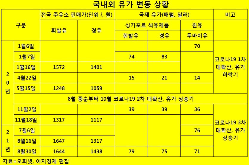 게대가 국내 유가에 2주 정도 시간을 두고 반영되는 싱가포르 현물시장의 배럴당 석유제품 가격도 지난해 11월 2일 휘발유와 경유가 각각 39달러에서 지난달 2일 83달러, 79달러로 각각 112.8%, 95.2% 역시 급등했다.