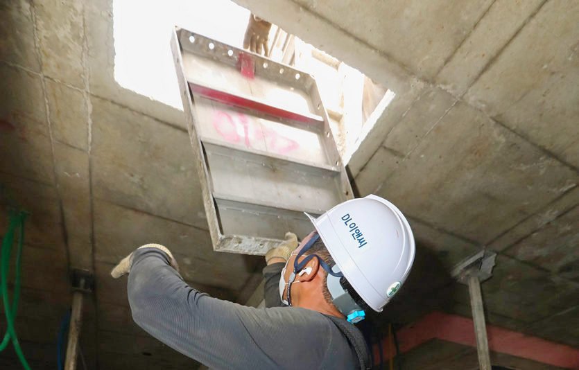 DL이앤씨는 작업자가 무거운 장비를 옮기거나 들어 올릴 때 도움을 주는 근력보조 웨어러블 슈트를 고중량 반복작업이 많은 현장에서 적용하고 있다.
