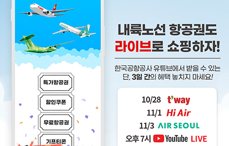 [이지경제=김진이 기자] 한국공항공사(사장 손창완)는 공사 유튜브 채널에서 내륙 노선 활성화를 위한 생방송 판매를 진행한다고 27일 밝혔다.