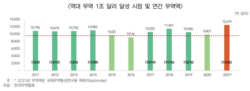 예상보다 빠른 글로벌 경기 회복과 수출단가 상승 영향으로 이미 1~10월 수출액이 지난해 연간 수출실적을 넘어섰고, 지난 10월 26일 기준 사상 최단기간 무역 1조달러(1182조8,000억원)를 달성했다.