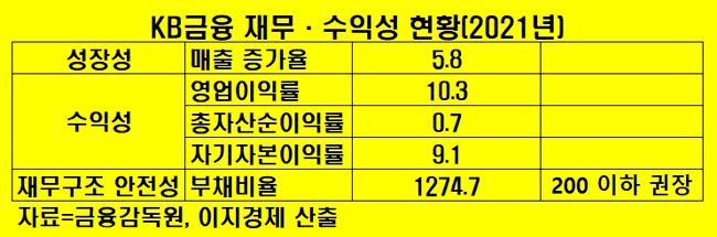 한편, KB금융의 재무구조는 다소 불안정하다. 부채비율은 1274.7%다. 자본의 타인의존도(차입경영)를 뜻하는 부채비율은 200 이하 유지가 이상적이다. 은행 역시 증권사 수탁금과 마찬가지로 고객예금이 부채로 잡히기 때문이다.