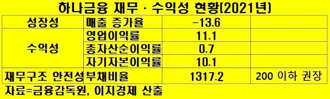 한편, 하나금융의 지난해 부채비율은 1317%로 전년보다 41.5%포인트 개선됐지만, 재무구조는 여전히 불안정하다. 은행 역시 증권사 수탁금과 마찬가지로 고객예금이 부채로 잡히기 때문이다. 자본의 타인의존도(차입경영)를 뜻하는 부채비율은 200 이하 유지를 재계는 권장하고 있다.