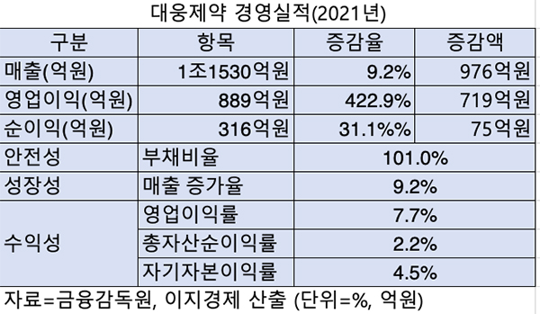 대웅제약의 재무구조는 탄탄하다. 대웅제약의 지난해 부채비율은 101%로 전년보다 12.3%포인트 개선됐다. 부채비율은 200 이하 유지가 이상적이다.