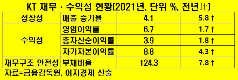 영업이익률과 함께 수익성 지표인 총자산순이익률(ROA)과 자기자본이익률(ROE)도 개선됐다. KT의 ROA와 ROE는 각각 3.9%, 8.8%로 전년보다 1.8%포인트, 4.3% 포인트 상승했다.