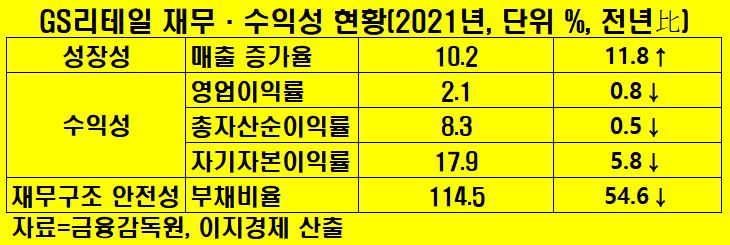 기업 자본의 타인의존도(차입경영)를 뜻하는 부채비율은 200 이하를 유지하면서, GS리테일의 재무가 안정적인 것으로 파악됐다. GS리테일은 지난해 부채비율은 114.5%로 전년보다 54.6% 포인트 떨어졌다. 재계는 부채비율 200 이하 유지를 권고하고 있다.