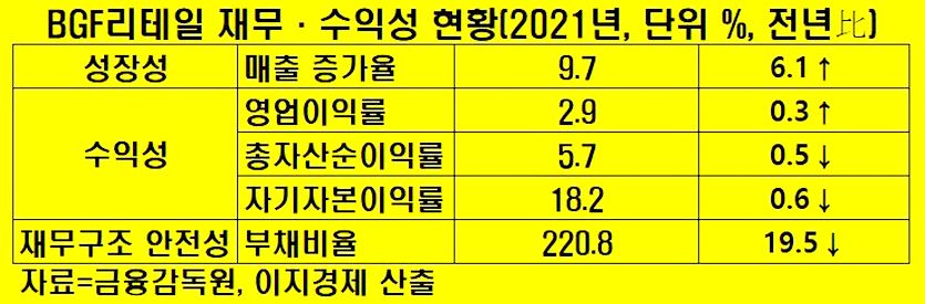 이로써 BGF리테일의 지난해 영업이익률은 2.9%로 전년보다 0.3% 포인트 늘었다. BGF리테일이 1000원치를 팔아 2020년 26원의 이익을 냈지만, 지난해에는 29원을 번 셈이다.