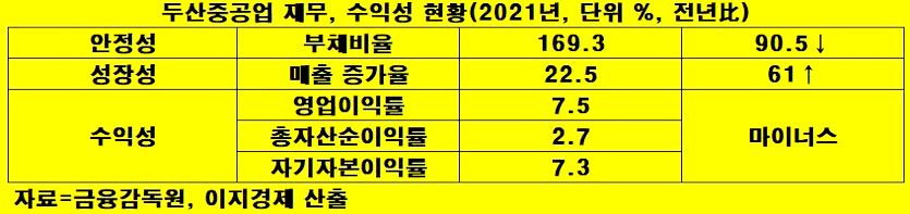부채탕감으로 두산중공업의 재무구조도 탄탄해졌다. 부채비율이 전년 259.8%에서 지난해 169.3%로 떨어져서다. 기업 자본의 타인의존도(차입경영)를 뜻하는 부채비율은 200 이하 유지를 재계는 권장하고 있다.