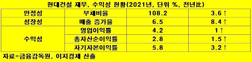 기업의 성장성을 의미라는 매출증가율 역시 현대건설이 코로나19 1년차인 2020년 역성장(전년대비 1.9%)을 극복하고 지난해 성장세로 돌아섰다.