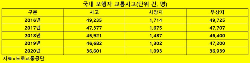 실제 국내 보행자 교통사고는 2016년 4만9253건에서 2020년 3만6601건으로 25.% 감소했지만, 같은 기간 사망자는 1093면, 부상자는 3만3939명으로 여전히 많기 때문이다.