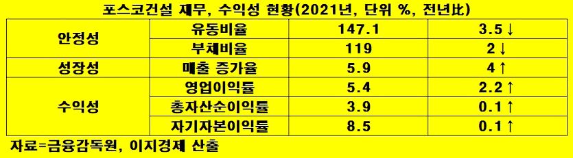 포스코건설의 지난해 유동비율은 147.1%로 전년보다 3.5%포인트, 이기간 부채비율은 119%로 2%포인트 각각 하락했다. 기업의 지급능력인 유동비율은 200 이상을, 자본의 타인의존도(차입경영)를 뜻하는 부채비율은 200 이하 유지를 재계는 권장하고 있다.