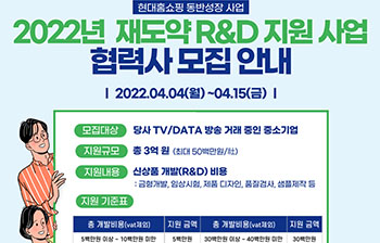현대홈쇼핑은 이달 4일부터 15일까지 중소협력사를 대상으로 ‘재도약 R&D 지원사업’ 대상 업체 모집한다고 3일 밝혔다.