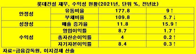 롯데건설의 재무 구조도 안정적이다. 지난해 유동비율이 177.8%, 부채비율이 109.8%로 전년보다 각각 9% 상승했고, 5.7% 하락해서다. 기업의 지급능력인 유동비율은 200 이상을, 자본의 타인의존도(차입경영)를 뜻하는 부채비율은 200 이하 유지를 재계는 권장하고 있다.