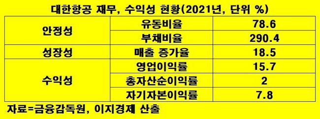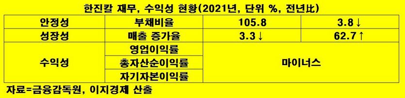 한진칼의 영업이익률과 총자산순이익률(ROA), 자기자본이익률(ROE) 등 수익성 지표가 모두 마이너스지만, 올해 성장 전환이 유력하다는 게 증권가 분석이다.