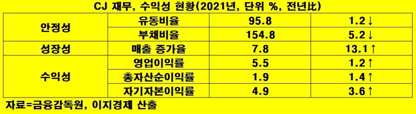 다만, 영업이익률과 함께 수익성 지표인 총자산순이익률(ROA)과 자기자본이익률(ROE)은 개선됐다. CJ의 지난해 ROA와 ROE는 각각 1.9%, 4.9%로 전년보다 각각 1.4%포인트, 3.6%포인트 상승했다.