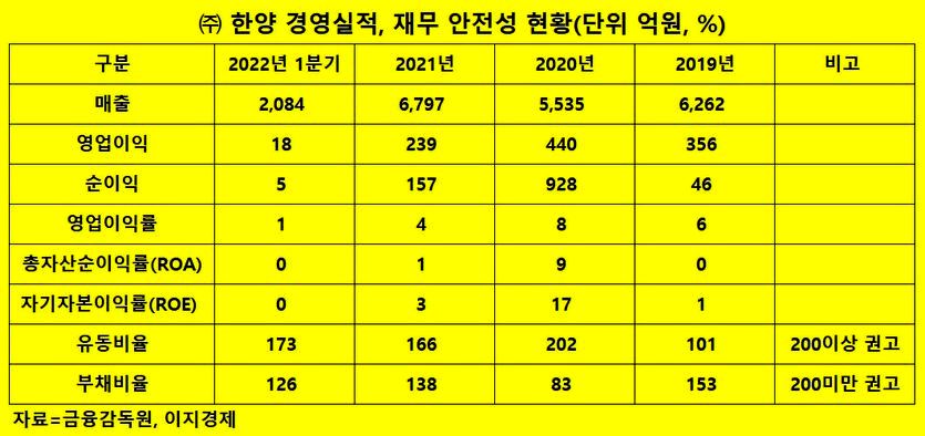 한양의 재무구조는 다소 개선됐지만, 여전히 불안한 모습이다.