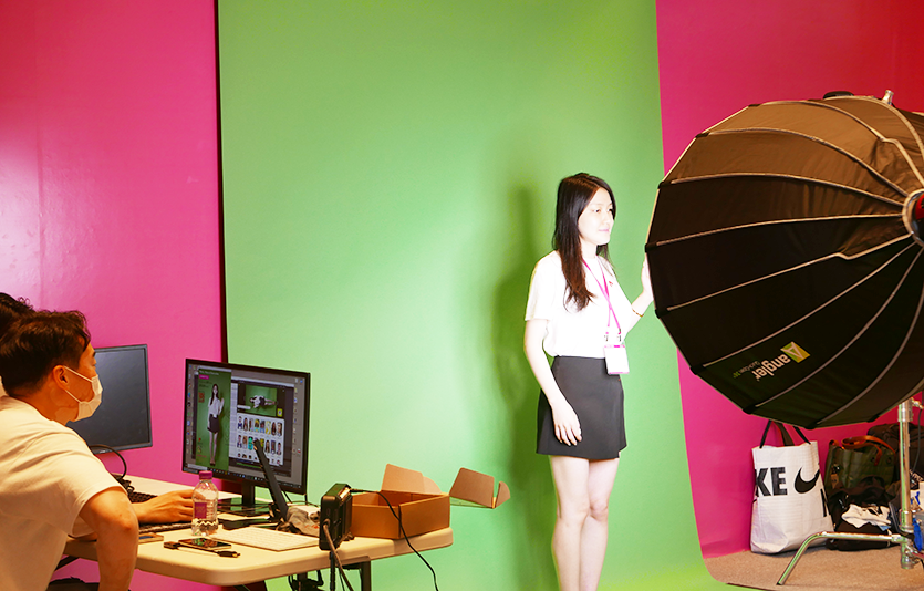모션캡쳐 및 버츄얼(가상) 캐릭터 브랜드 ‘오이스터’ 부스에서 모션캡쳐를 체험해 보고 있다.