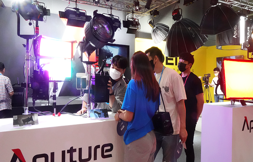 영상조명 제품을 보면서 이야기를 나누는 참관객들.