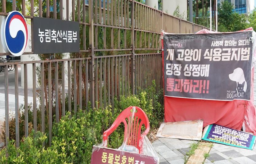 개·고양이 식용 금지법을 통과시키라는 내용을 담은 동물보호단체의 천막을 7일 세종특별자치시 어진동 농림축산식품부 앞에서 촬영했다.