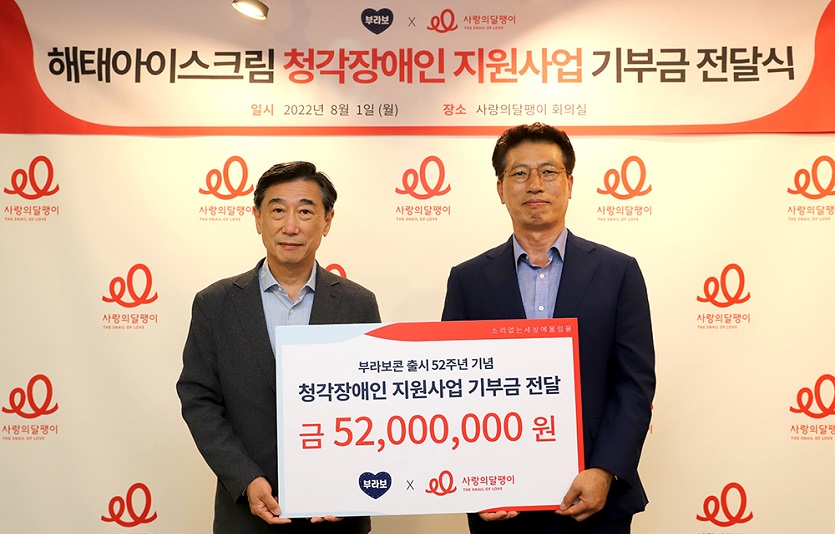 청각장애인을 지원하는 사단법인 사랑의달팽이(회장 김민자)는 해태아이스크림이 부라보콘 출시 52주년을 기념해 청각장애인 지원사업으로 후원금 5200만원을 기부했다고 3일 밝혔다.