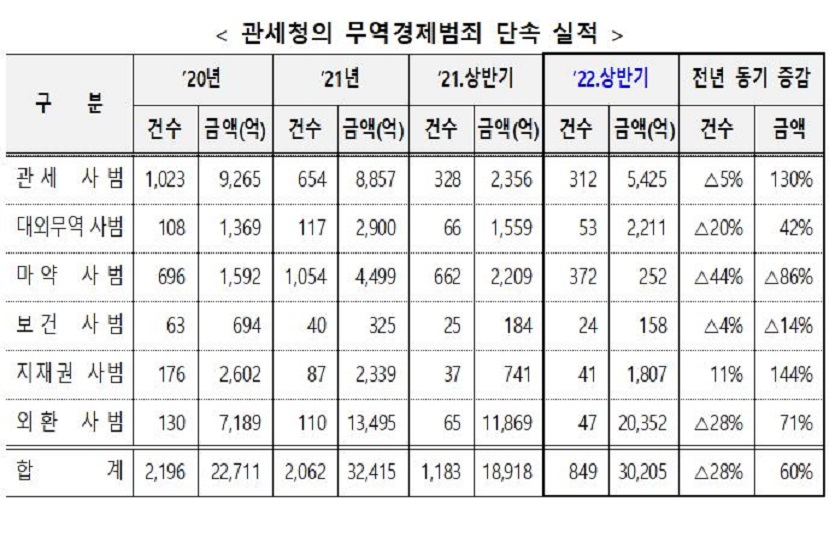 [이지경제=윤현옥 기자] 관세청(청장 윤태식)은 올해 상반기에 총 3조205억원 규모의 무역경제범죄 849건을 적발했다고 17일 밝혔다.