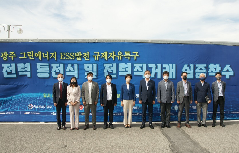 중소벤처기업부(장관 이영)와 광주광역시(시장 강기정)는 9월 14일, 광주 그린에너지 ESS발전 규제자유특구에서 국내 최초로 대용량 전기저장장치(ESS)발전사업자의 전력 직거래 실증을 위한 전력통전식을 개최했다고 밝혔다.