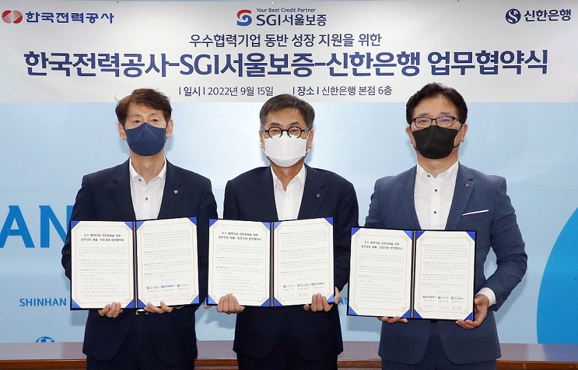 신한은행(은행장 진옥동)은 한국전력공사 및 SGI서울보증과 함께 한국전력공사의 우수 협력기업에 대한 금융 지원 업무협약을 체결했다고 16일 밝혔다.