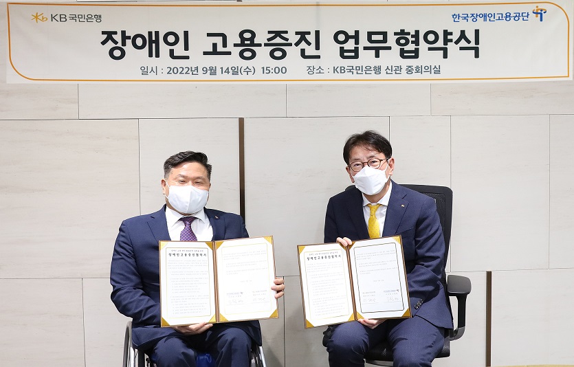 KB국민은행(은행장 이재근)은 한국장애인고용공단(이사장 조향현)과 ‘장애인 고용 증진을 위한 업무협약’을 맺었다.