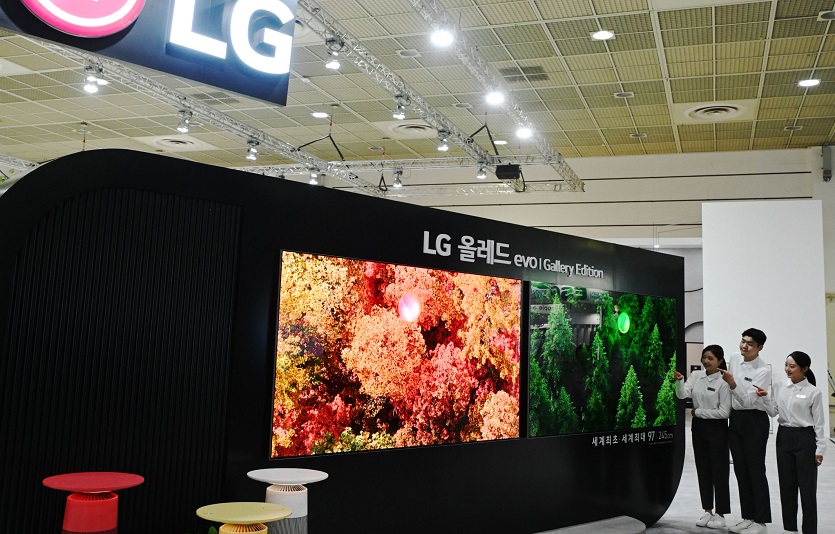 LG전자는 ‘차별화된 고객경험’을 선사하는 혁신 제품들을 대거 선보인다. 904㎡ 규모 전시관 입구에 세계 최대 97형 올레드 TV와 도어 색상을 변경할 수 있는 냉장고 LG 디오스 오브제컬렉션 무드업을 내세워 관람객들의 눈길을 사로잡았다.
