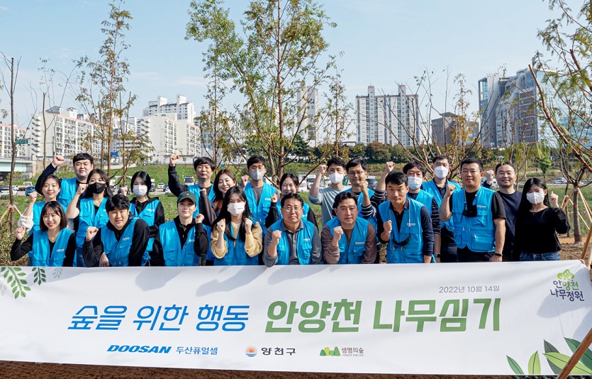 두산퓨얼셀은 앞서 12일, ‘생명의 숲’과 ‘도시숲 조성과 탄소중립 실천’을 위한 업무협약(MOU)을 체결하고 나무심기 활동을 진행했다. 두산퓨얼셀 임직원 20여명은 안양천에서 360그루의 나무를 심으며, 숲의 소중함을 느끼고 생활에서의 탄소중립 의지를 다졌다.