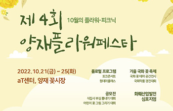 21일 aT에 따르면 이번 가을꽃 축제는 꽃꽂이 등 소비자가 직접 참가 가능한 ‘양재 플라워페스타’와 다양한 국화 작품 전시 관람이 가능한 ‘국화꽃 축제’, 화훼 산업의 현재와 미래를 주제로 ‘화훼산업 발전 심포지엄’ 등으로 진행된다.