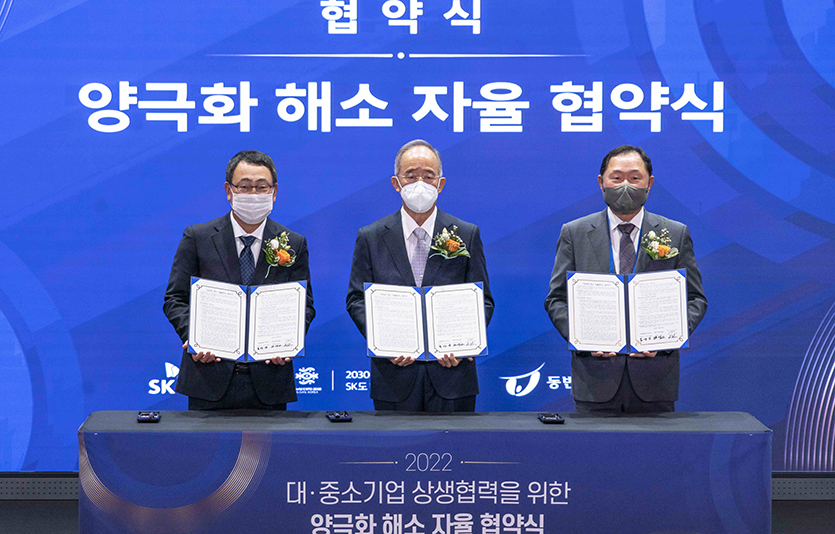 이날 현장에서 SK텔레콤은 동반성장위원회, 유엔젤과 ‘양극화 해소 자율협약’을 체결했다. 이번 협약을 바탕으로 SK텔레콤은 2024년까지 중소기업 제품 구매, 금융, 채용과 교육 등에 약 8058억원을 지원할 예정이다.