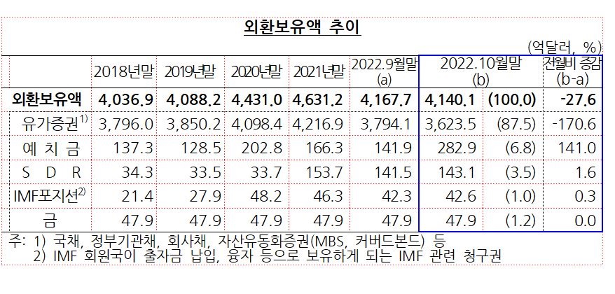 [이지경제=윤현옥 기자] 22년 10월말 현재 우리나라 외환보유액은 4140억1000만달러로 전월말대비 27억6000만달러가 감소했다.