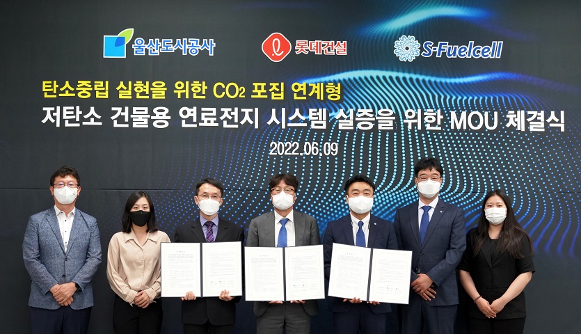 롯데건설은 올해 6월 에스퓨얼셀 및 울산광역시 도시개발공사와 ‘CO2 포집 연계형 저탄소 건물용 연료전지 시스템 실증 업무협약’을 체결했다. 이를 통해 연료전지 관련 사업 활성화 및 산업 생태계 형성에 기여할 수 있도록 공동 연구개발을 수행할 계획이다.