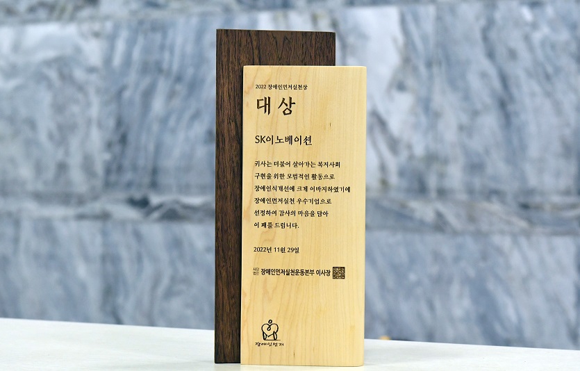 SK이노베이션이 사단법인 장애인먼저실천운동본부 주최 ‘2022 장애인먼저실천상’ 사회통합부문 대상을 수상했다고 2일 밝혔다.