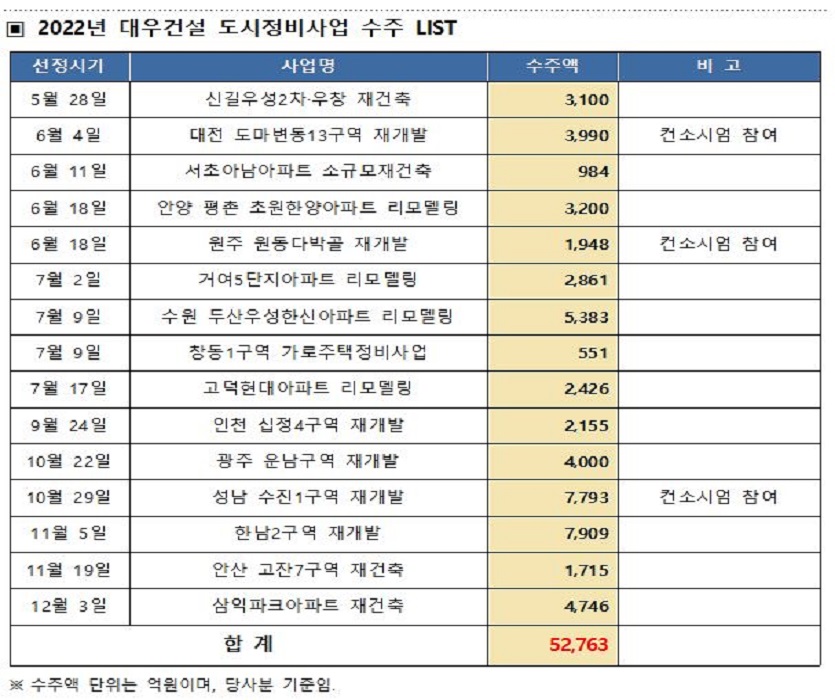 이로써 대우건설은 올해 ▲신길우성2차우창아파트 재건축 ▲서초아남아파트 소규모재건축 ▲원동다박골 재개발 ▲도마변동13구역 재개발 ▲안양 초원한양아파트 리모델링 ▲거여5단지아파트 리모델링 ▲고덕현대아파트 리모델링 ▲두산우성한신아파트 리모델링 ▲창동1구역 가로주택정비사업 ▲십정4구역 재개발 ▲수진1구역 재개발 ▲운남구역 재개발 ▲한남2구역 재개발 ▲고잔7구역 재건축 ▲삼익파크아파트 재건축 등 도시정비사업 부문에서 총 15개 프로젝트의 시공권을 획득하며 5조2763억원의 수주고를 올렸다.