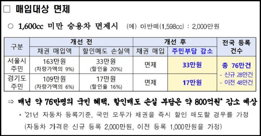 이에 따르면 1000~1600cc 미만의 비용업용 승용차를 신규·이전등록할 경우 지역개발채권·도시철도채권의 의무매입이 면제된다.
