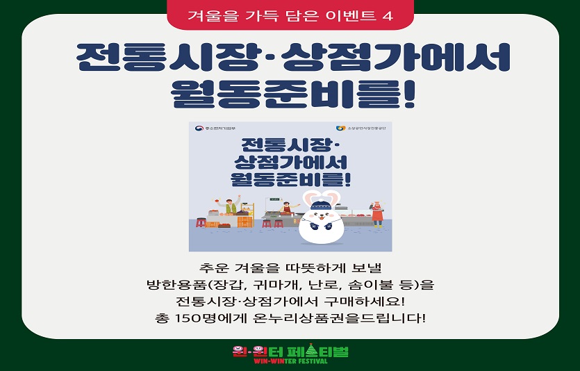 [이지경제=윤현옥 기자] 중소벤처기업부(장관 이영)는 16일부터 25일까지 10일간 진행하는 ‘한겨울의 동행축제 윈·윈터 페스티벌’에 전국 1700여개 전통시장 및 상점가(이하 전통시장)이 참여한다고 15일 밝혔다.
