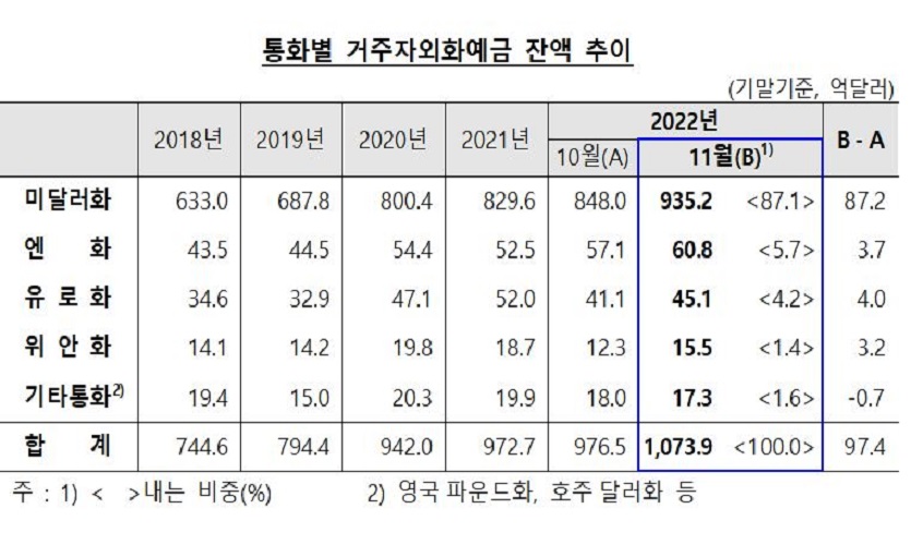 통화별로는 달러화예금과 유로화예금이 전월말 대비 각각 97억2000천만달러, 4억달러 증가했다.