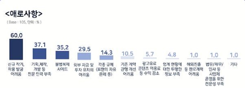 웹툰사업 추진 시 겪는 어려움(1+2순위 응답 기준)으로는 ▲신규 작가/작품 발굴(60.0%)이 가장 많았다. 이어 ▲기획/제작/개발 등 전문 인력 부족(37.1%) ▲불법복제 사이트(35.2%) ▲외부 자금 및 투자 유치(29.5%) 순으로 조사되었다.