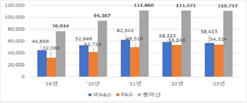 2022년 본예산 11조1571억원에 비해서는 834억원(0.7%) 감소했다. 내년도 경제활력 회복을 뒷받침하고 산업경쟁력을 강화할 수 있도록 국정과제와 미래 핵심전략기술에 대한 연구개발(R&D) 투자 등은 확대하였다.