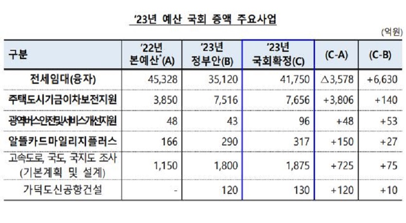 추가로 이번 국회 심의 과정에서 국토부 예산 및 기금은 전월세보증금 융자 이차보전사업, 2층 전기버스 투입을 위한 광역버스 지원, 알뜰교통카드마일리지 등이 민생 안정을 위해 정부안 대비 증액됐다.