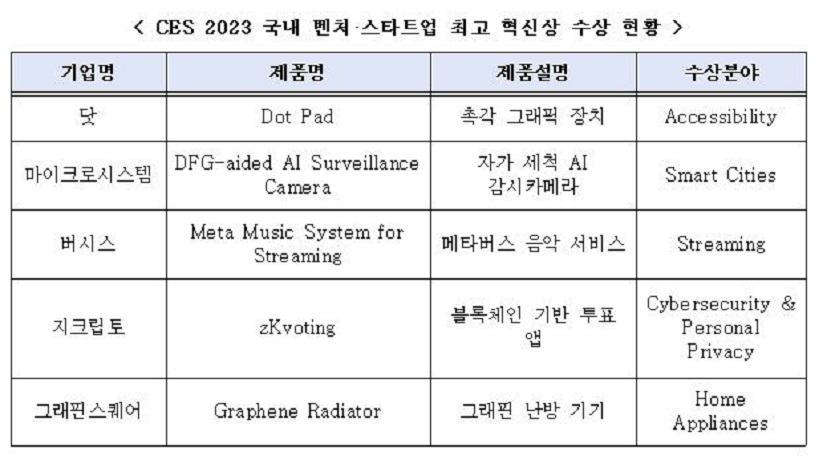 중기부는 LG전자, 삼성전자, 삼성전자 아메리카, SK 등 최고혁신상을 수상한 4개 대기업보다 5개 벤처·스타트업이 더 많은 최고 혁신상을 수상했으며, 이는 역대 벤처·스타트업의 최고 혁신상 소상 최대 실적이라고 17일 밝혔다.